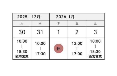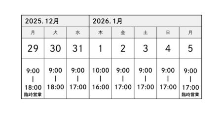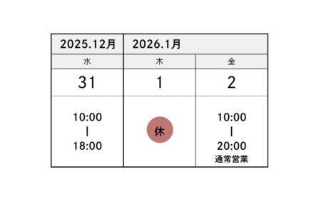 各店舗の年末年始の営業日、営業時間は以下の通りです。